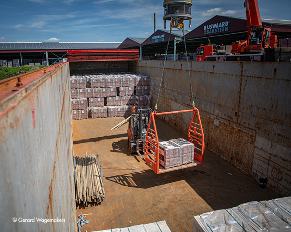 Le transport par navire s’intègre parfaitement dans la stratégie de durabilité plus large de De Rijswaard et de l’industrie céramique de construction. Alors que le transport routier contribue inévitablement aux émissions de CO₂ et à la congestion, la navigation intérieure constitue une alternative beaucoup plus respectueuse de l’environnement. Notre deuxième quai permet de transporter une plus grande part de l’approvisionnement en argile et de l’expédition des briques par bateau. Cela réduit non seulement les émissions, mais aussi notre dépendance au transport routier. Cette démarche correspond aux ambitions plus larges du secteur, telles qu’énoncées dans la Technology Roadmap Bouwkeramiek 2030, où la durabilité, l’optimisation de la chaîne et l’économie circulaire occupent une place centrale. Pour nos clients, cela signifie que chaque projet utilisant nos briques contribue indirectement à un impact environnemental plus faible. Ensemble, nous construisons un avenir où qualité et durabilité vont de pair.