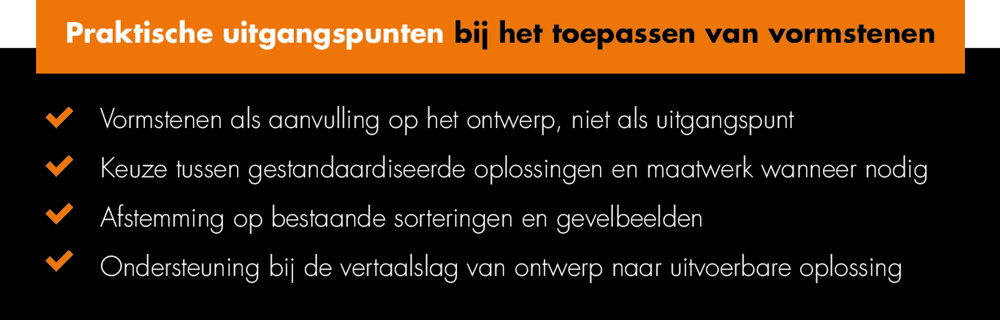 Deze oplossingen zijn bedoeld om het ontwerp praktisch uitvoerbaar te houden. Vormstenen worden ingezet wanneer standaard bakstenen tekortschieten, zonder het bouwproces onnodig complex te maken.